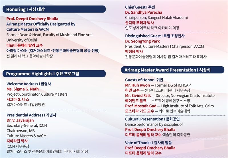 The Arirang Master Award Ceremony, jointly organized by Culture Masters and the Advocacy Alliance for Culture Masters (AACM), will take place on December 12 at the India International Centre (IIC) in New Delhi. The event is held in cooperation with the Inter-City Intangible Cultural Cooperation Network (ICCN) and Folkland International, with official support from the India International Centre and 25 News.