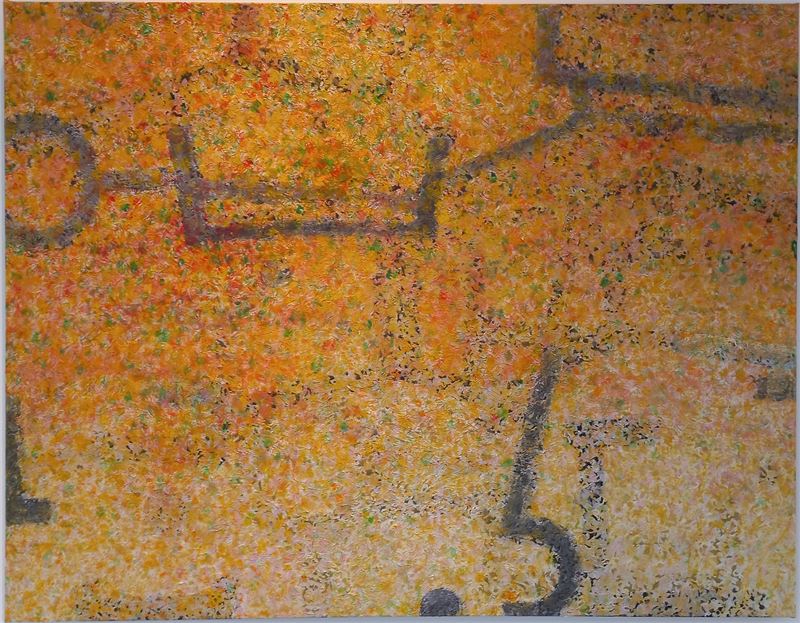 In her works, the flat plane of the canvas and the three-dimensional object of the knot merge, with the plane often reflecting the earth or the sky. This plane, beyond mere physical flatness, encapsulates the Oriental view of the universe. Traditional Korean paper, known for its absorbency, not only absorbs ink but also retains external forces like moisture, heat, and noise, preserving their silent value within the painting. Utilizing such materials with life-sustaining characteristics, the artist internalizes and imbues her works with the precious spiritual values of her lived experience. Her bold compositions through color field division create spaces that interlock to form a unified base, with knotted buttons expanding the visual space, making the canvas feel like an expansive sky of cosmic space.