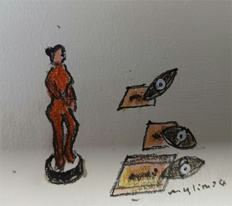 그림 배우는 사람들이 몇 명 있었다. 나한테 스케치할 수 있는 종이를 몇 장 갖다 주면서 그림을 그려보란다. 무슨 그림이냐고 하니? 함께 있던 젊은 여자 한 분이 모델이라면서 포즈를 취하는 것이 아닌가? 모두 그 모델이 포즈를 바꿀 때마다 그림을 그려나간다. 나도 다양한 포즈를 따라 그린다. 민망할 정도의 정면을 그리려니 낯이 뜨겁기도 했지만 결국은 그려냈다. 모두 내가 그린 데생을 보면서 이리저리 구경하더니 한마디로 오리엔탈 라인이라면서 그것이 특징이란다.