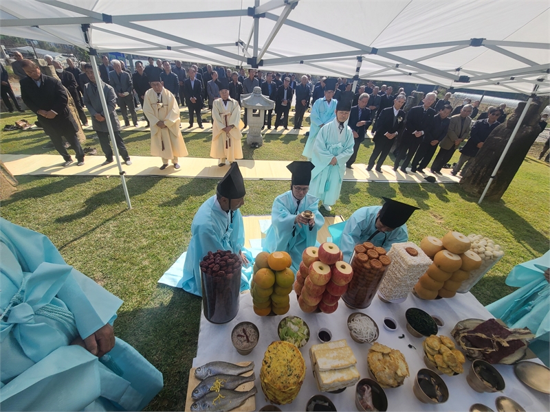 The ceremony, presided over by Park Seung-jang, head of the Se-yang Branch of the Bannam Park Clan, began with a traditional ritual (goyuje) and continued with the unveiling of the stele. Park Seung-won, head of the Bannam Park Clan Association, Park Seung-tae, vice-chairman, and Park Seung-nam, ritual officiant, led the proceedings in solemn reverence.