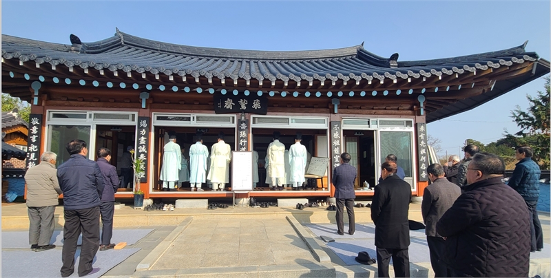 Photo 4. View of Bibongjae (飛鳳齋). Bibongjae is an ancestral hall (jaesil) where the clan venerates its forebears and conducts formal ancestral rites. In this photograph, officiants dressed in traditional white robes perform the ceremonial procedures before the ritual altar, while clan descendants stand respectfully outside, participating in the sihyang and jehyang rites.
